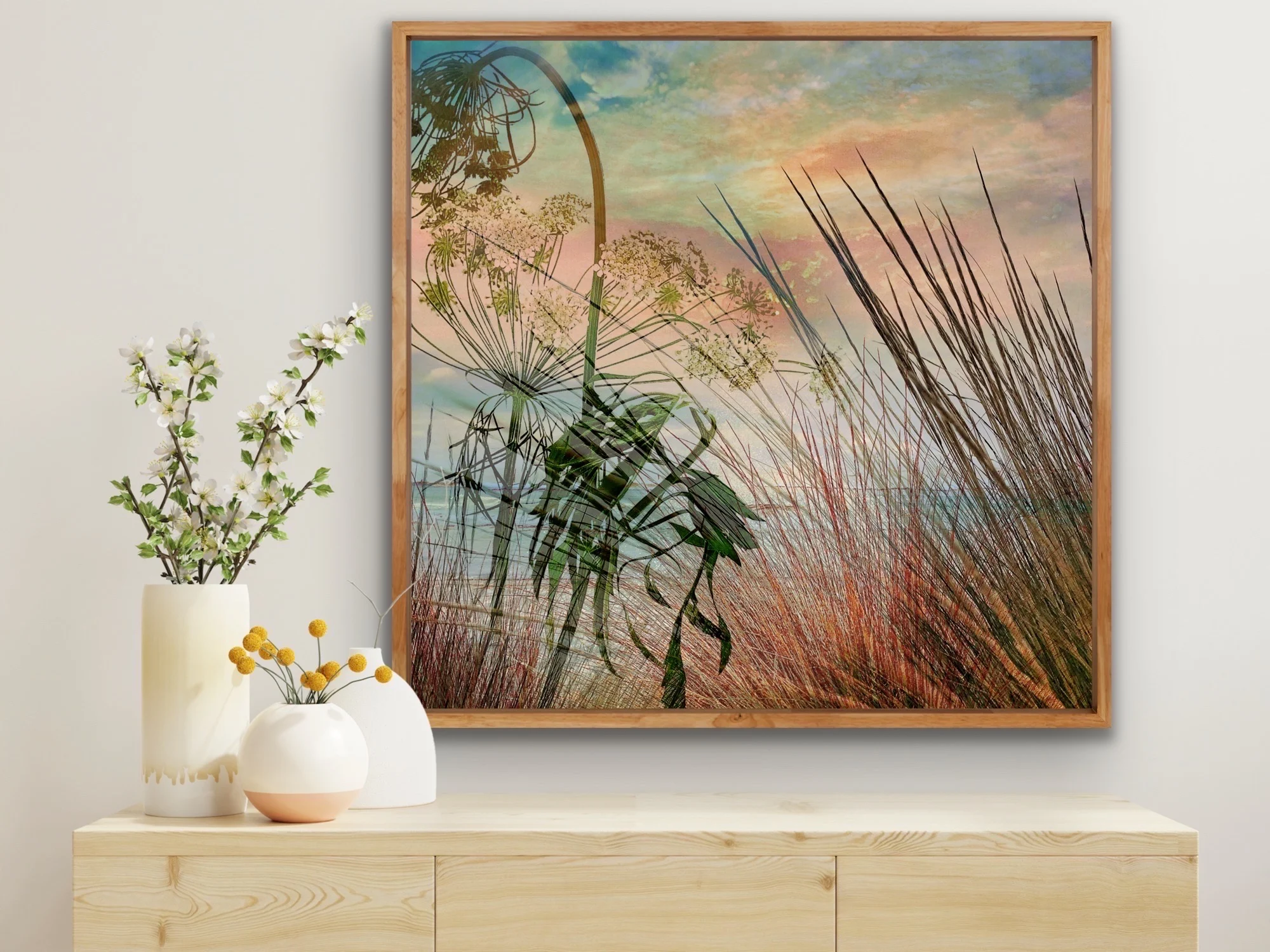 Original digital collage by Maria leoni printed and stretched on canvas, 80x80cm with a raw oak floating frame.