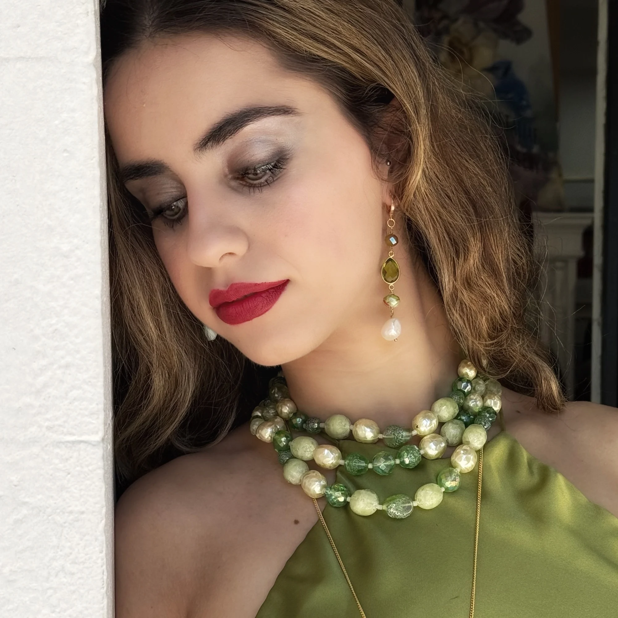 The earrings include faceted peridot, freshwater pearl, vintage Murano beads, chalcedony and crystals.