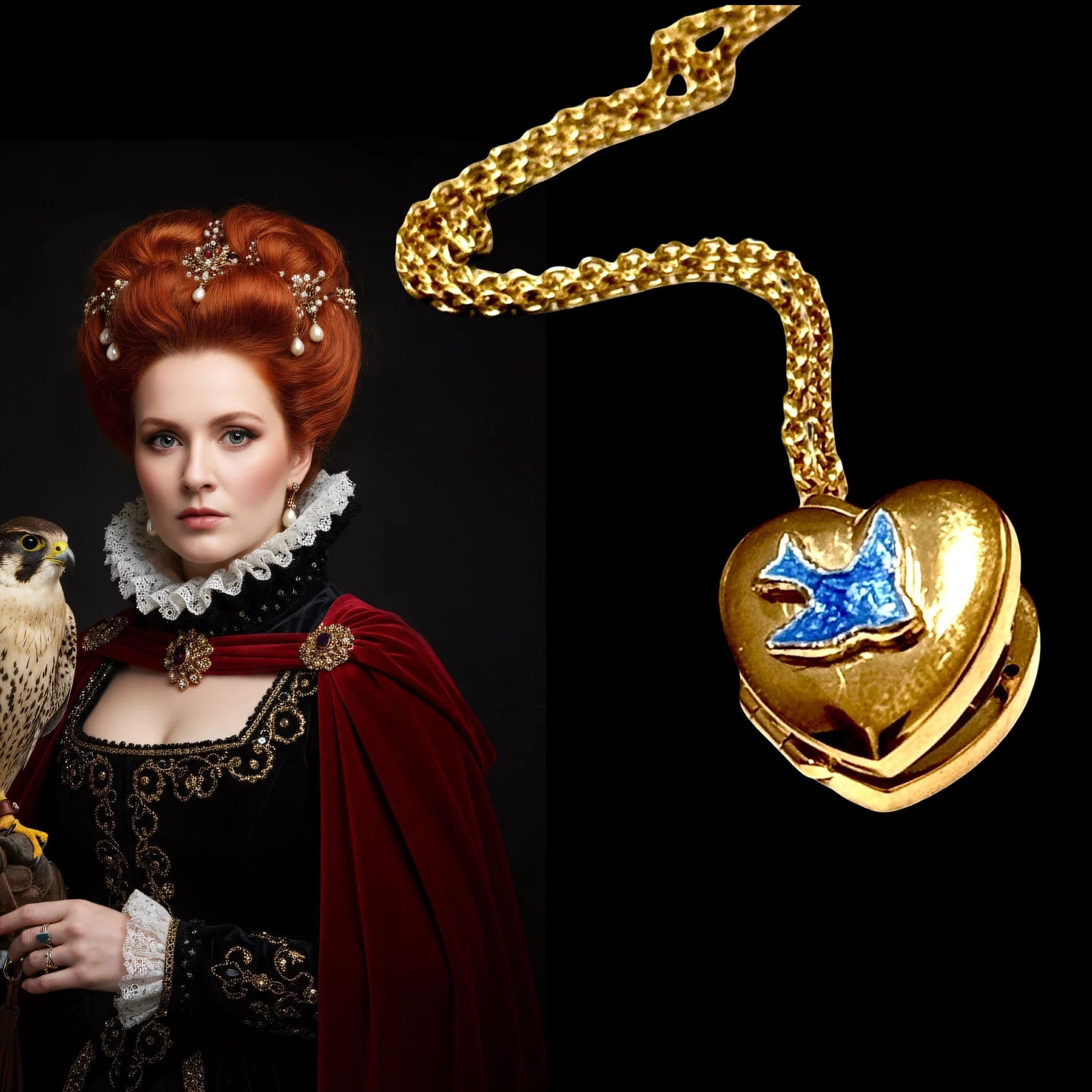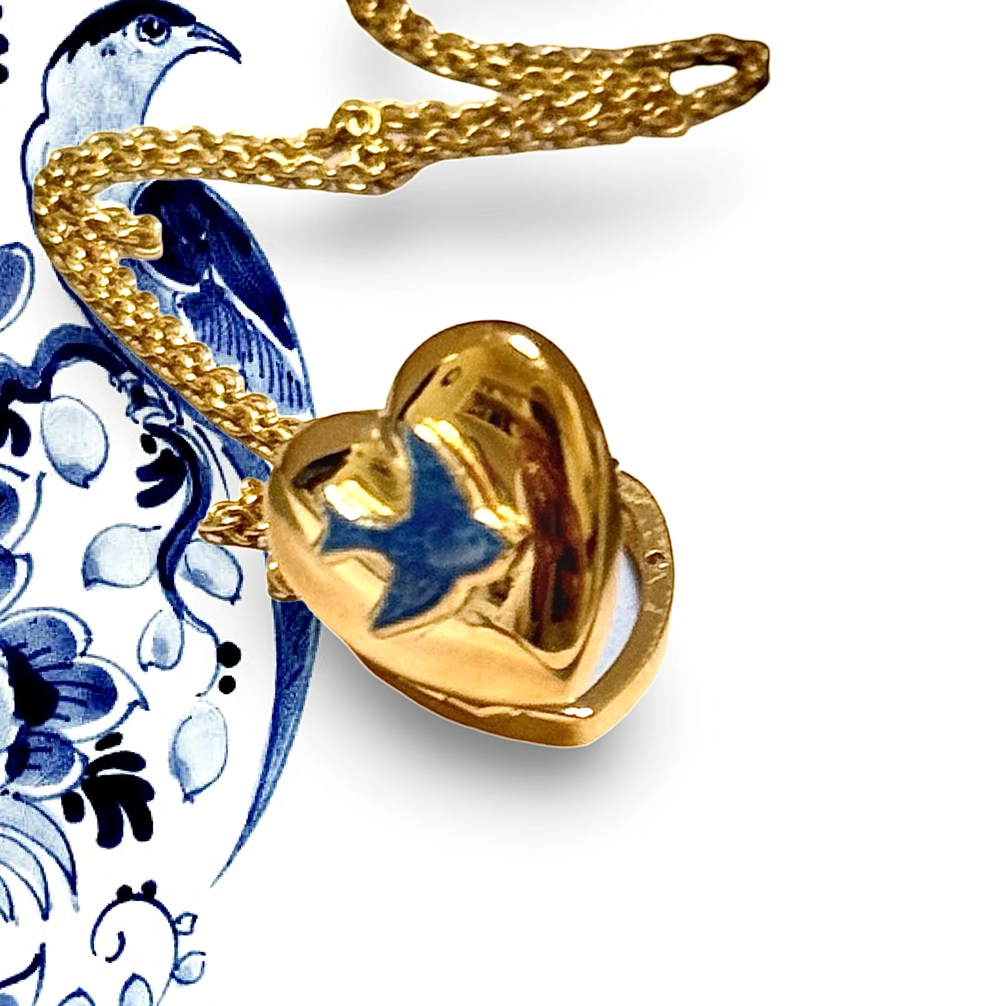 This beautiful, delicate heart locket has a sweet enameled blue bird on its front case. It sits 22inch (56cm) vintage sterling silver gold plate, German chain. The locket measures 2cm in diameter.