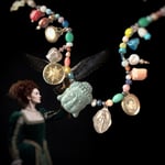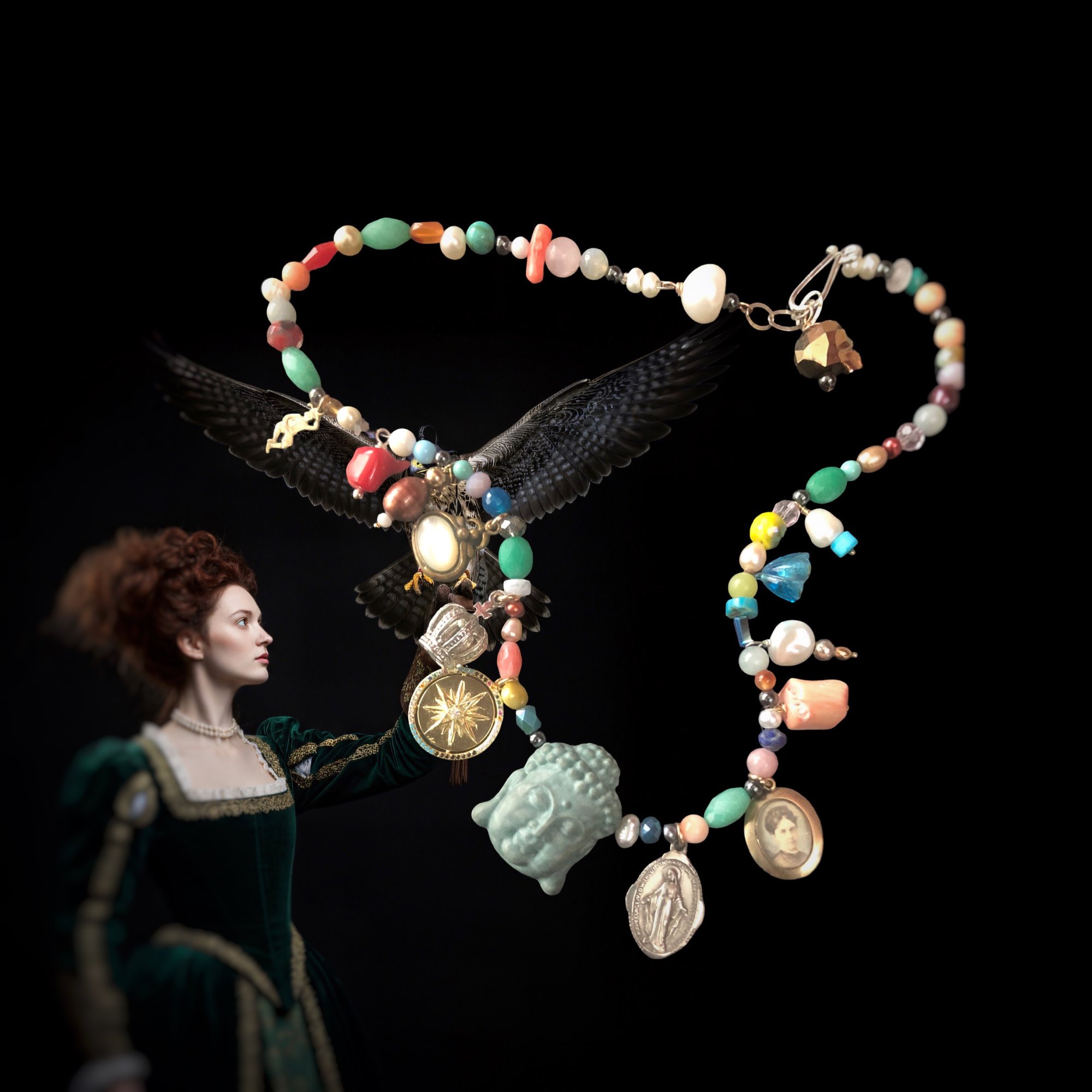 This is a real statement piece mixing metals, gemstones, pearls, charms and religious icons! Sterling silver, rolled gold and brass are used in its construction. The necklace measures 45cm with a 3cm extension.