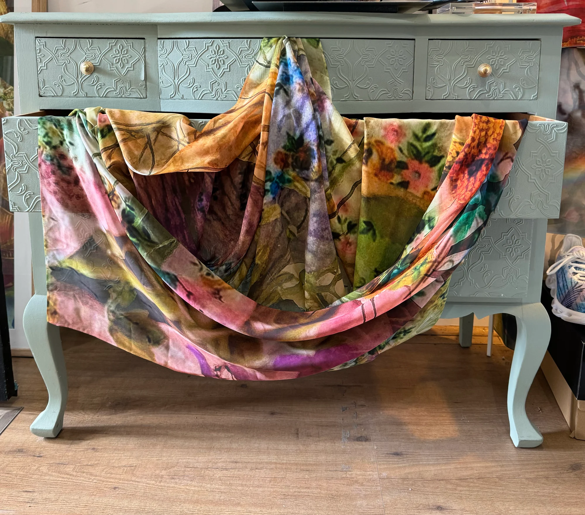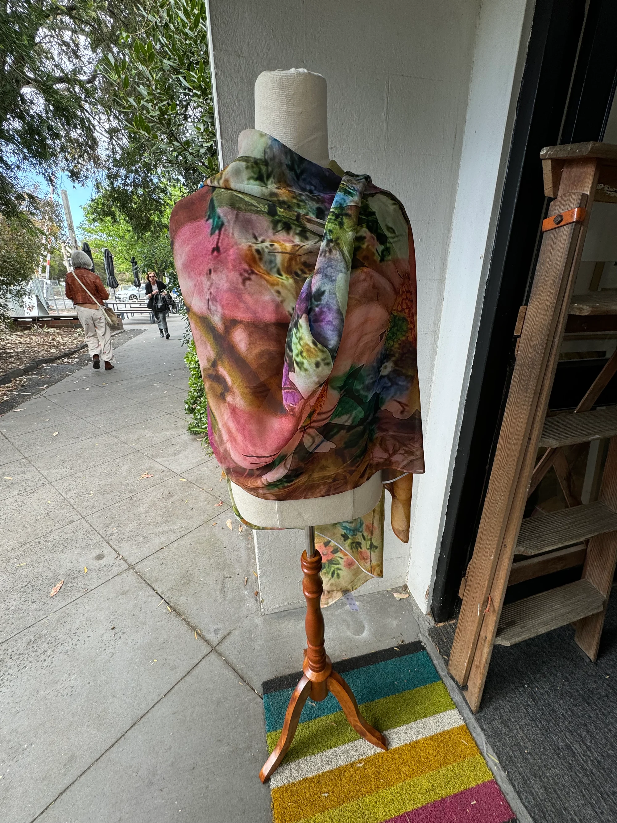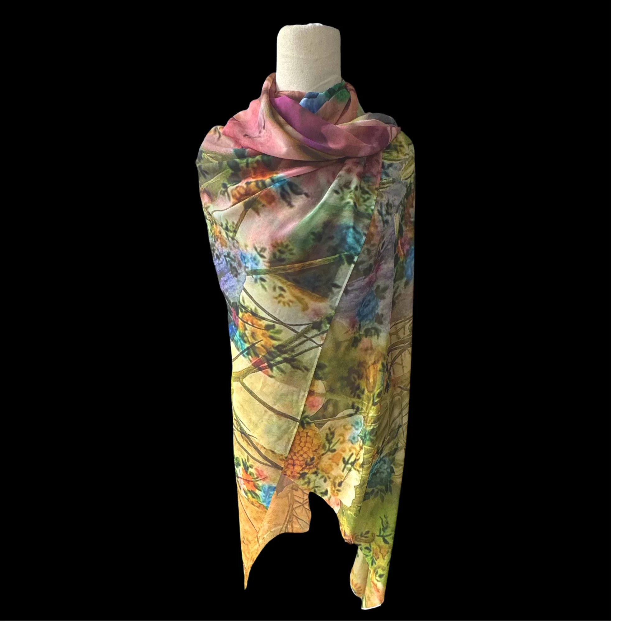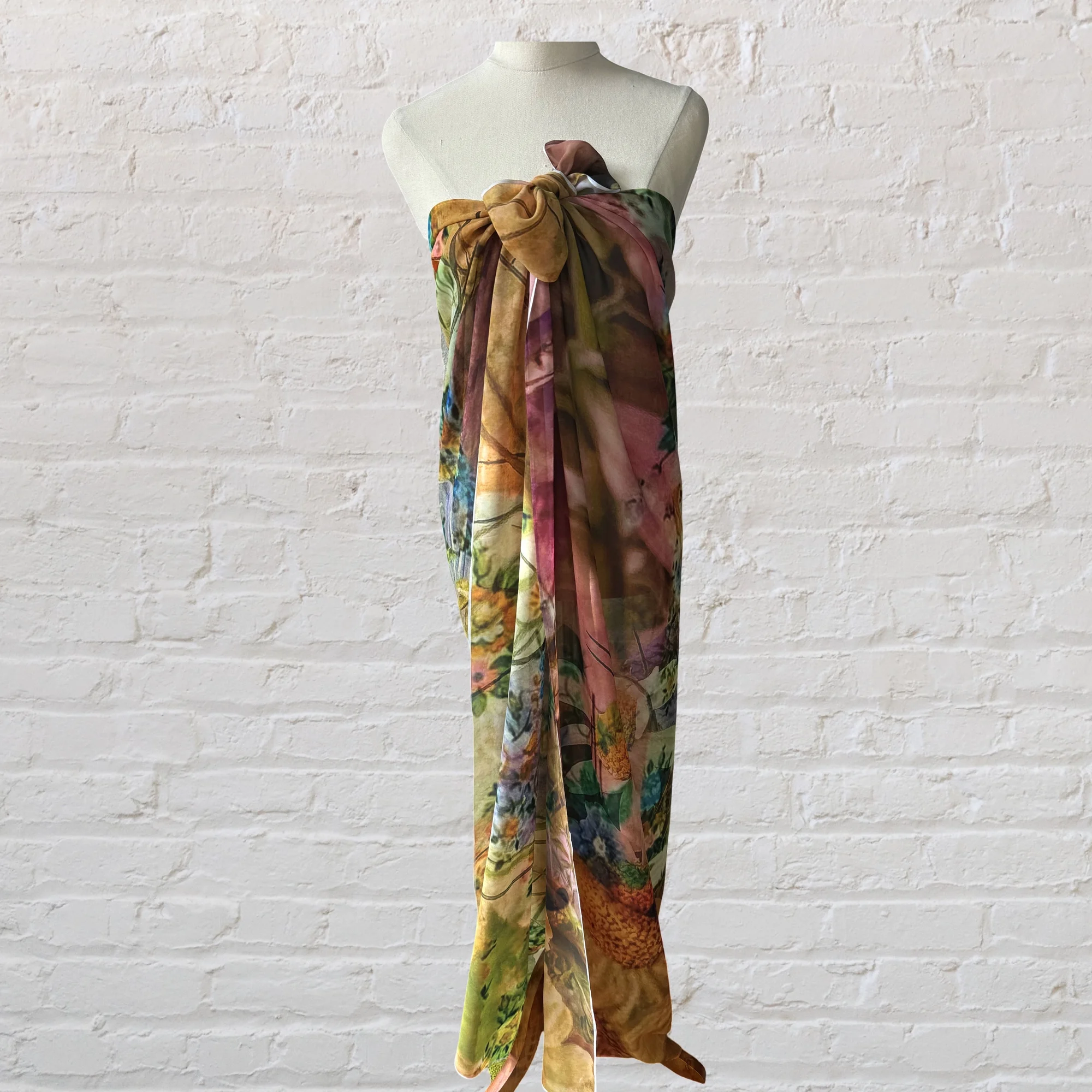 140cm square polyester scarf with an original photographic collage print.Can be worn in so many ways including as a sarong.