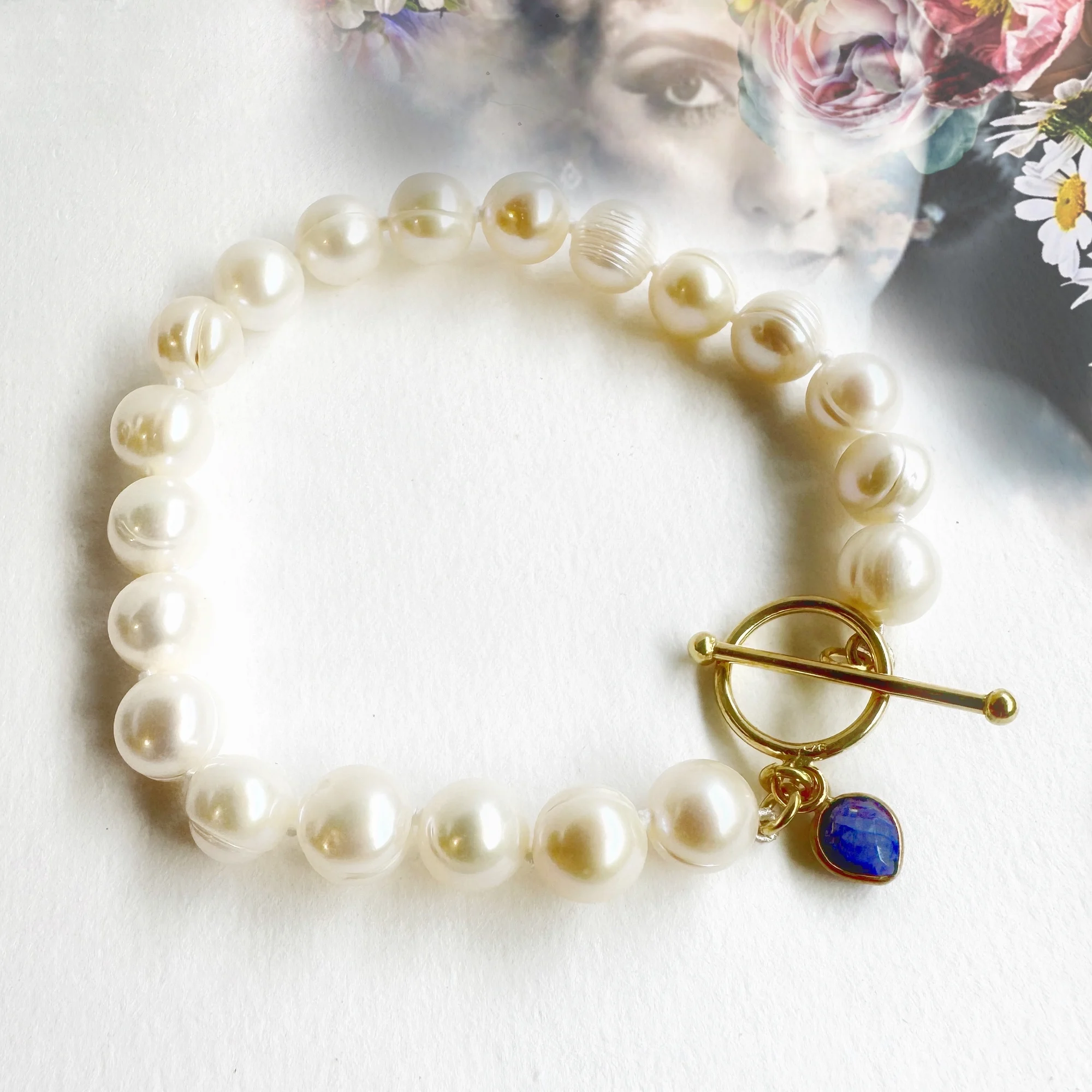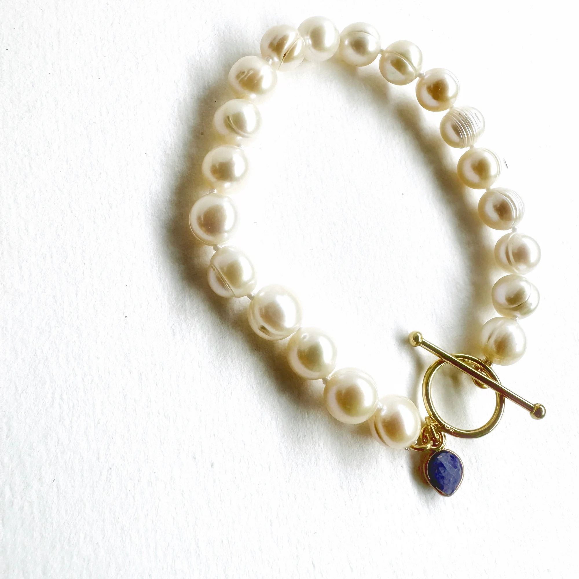 This sweet freshwater pearl bracelet is the perfect addition to your accessory collection or as a gift for Christmas or a special birthday. Classic 8mm white freshwater pearls are secured by a sterling silver, 22ct rolled gold fob clasp. A sapphire heart gemstone charm finishes this pretty bracelet which measures 19cm in length.