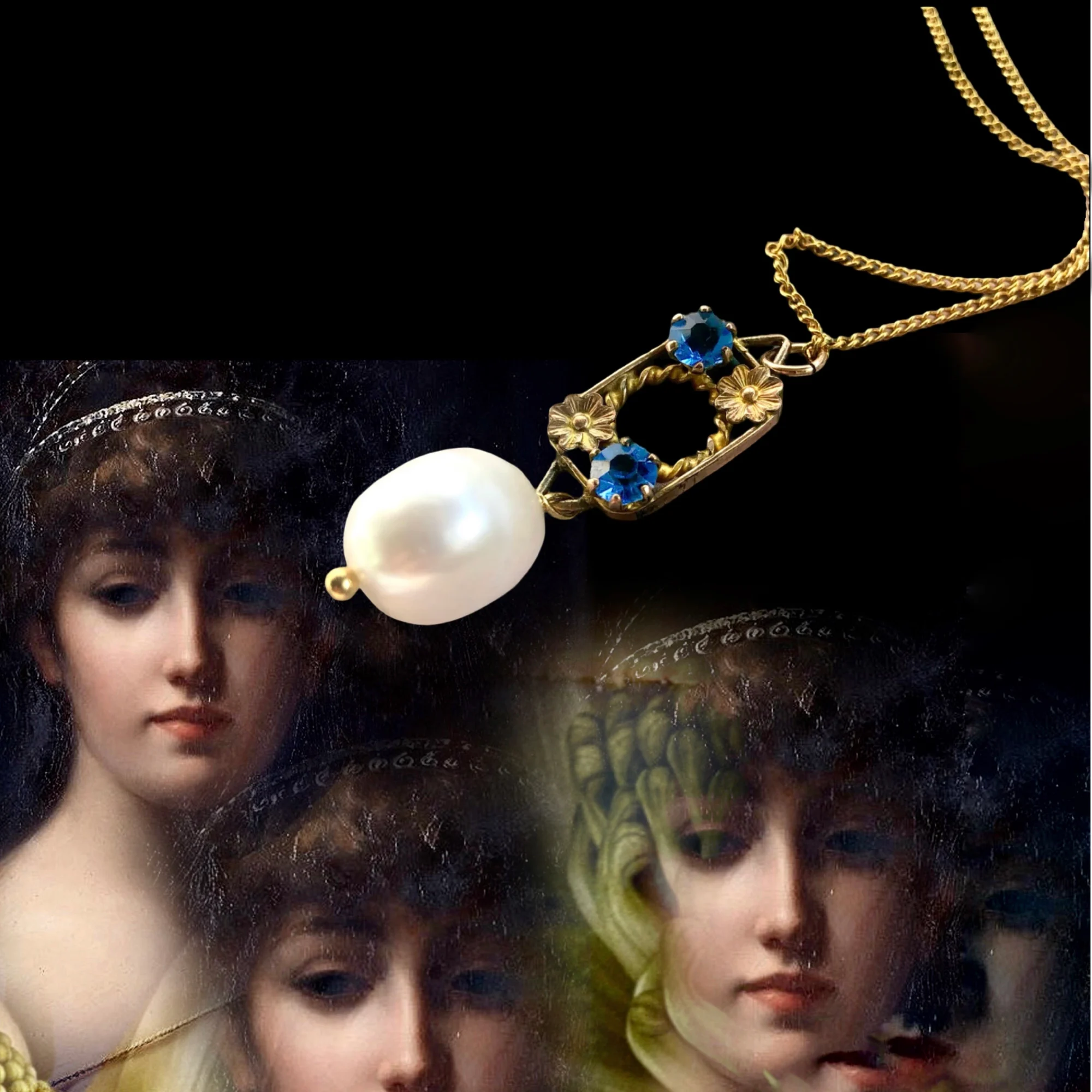 Kitty Vintage gold plate panel, brilliant blue Czech crystal and pearl pendant necklace