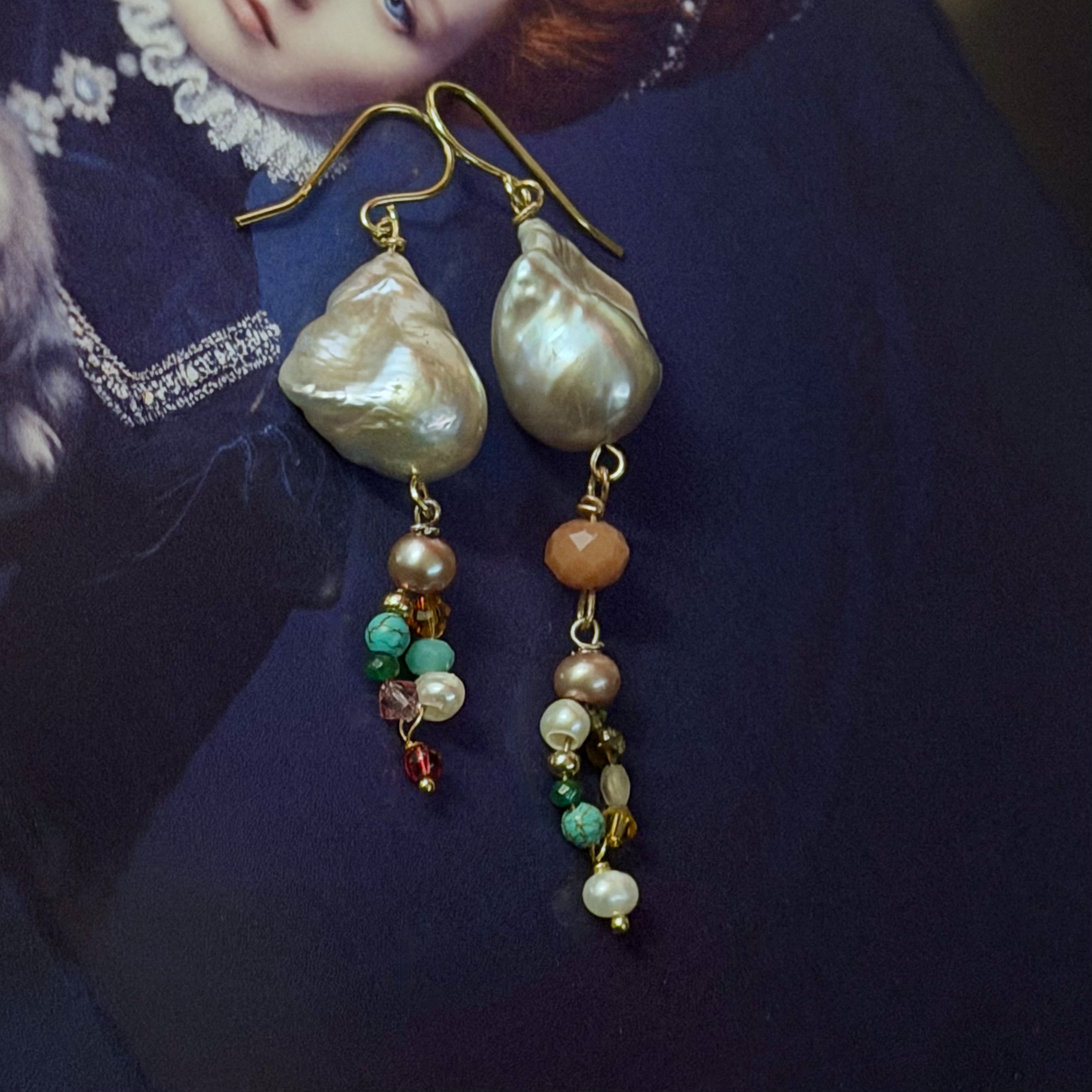 A beautiful pair of dove grey baroque pearls are the centre piece for these earrings, measuring approx. 3x2cms, from which asymmetrical groupings of gemstone, freshwater pearls and crystals hang. The earrings measure 8.5cms and 6cms in length.
