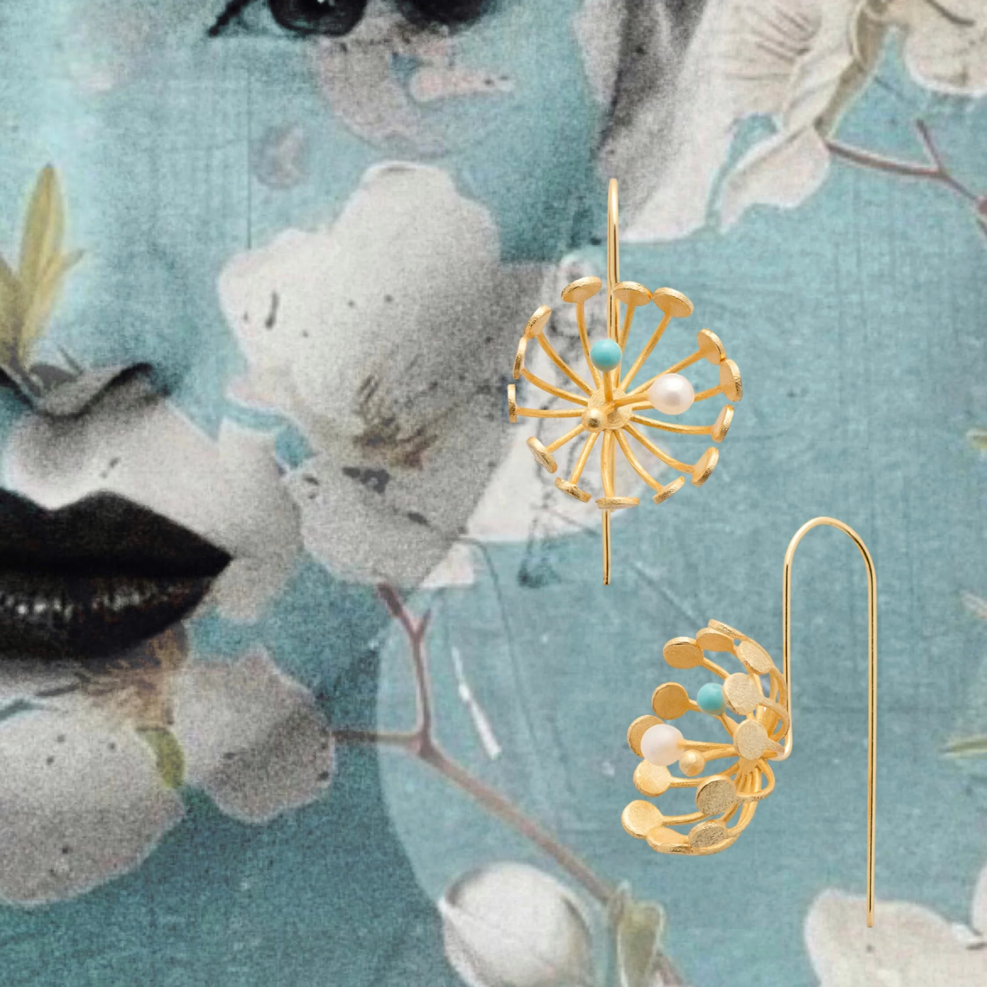 Delicate and yet making a statement chrysanthemum earrings are easy, light and comfortable to wear. Sweet white freshwater pearls, turquoise and gold drops enhance each of the flower centres. These earrings approx 2cm in diameter with a hook post extending 3.5cm from the ear lobe.