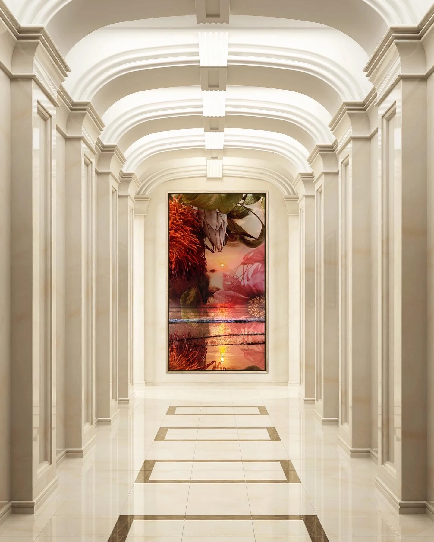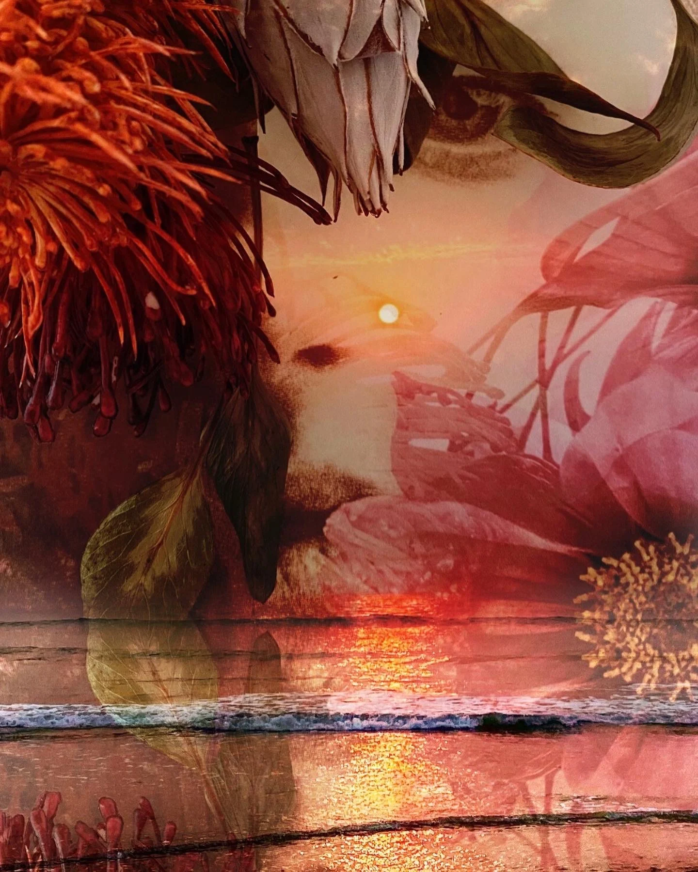Large canvas print 150x80cm of an original photographic collage of a sunrise at Point Lonsdale during the bush fires of 2020 over layed with Australian natives and peonies. Boxed framed in raw oak.