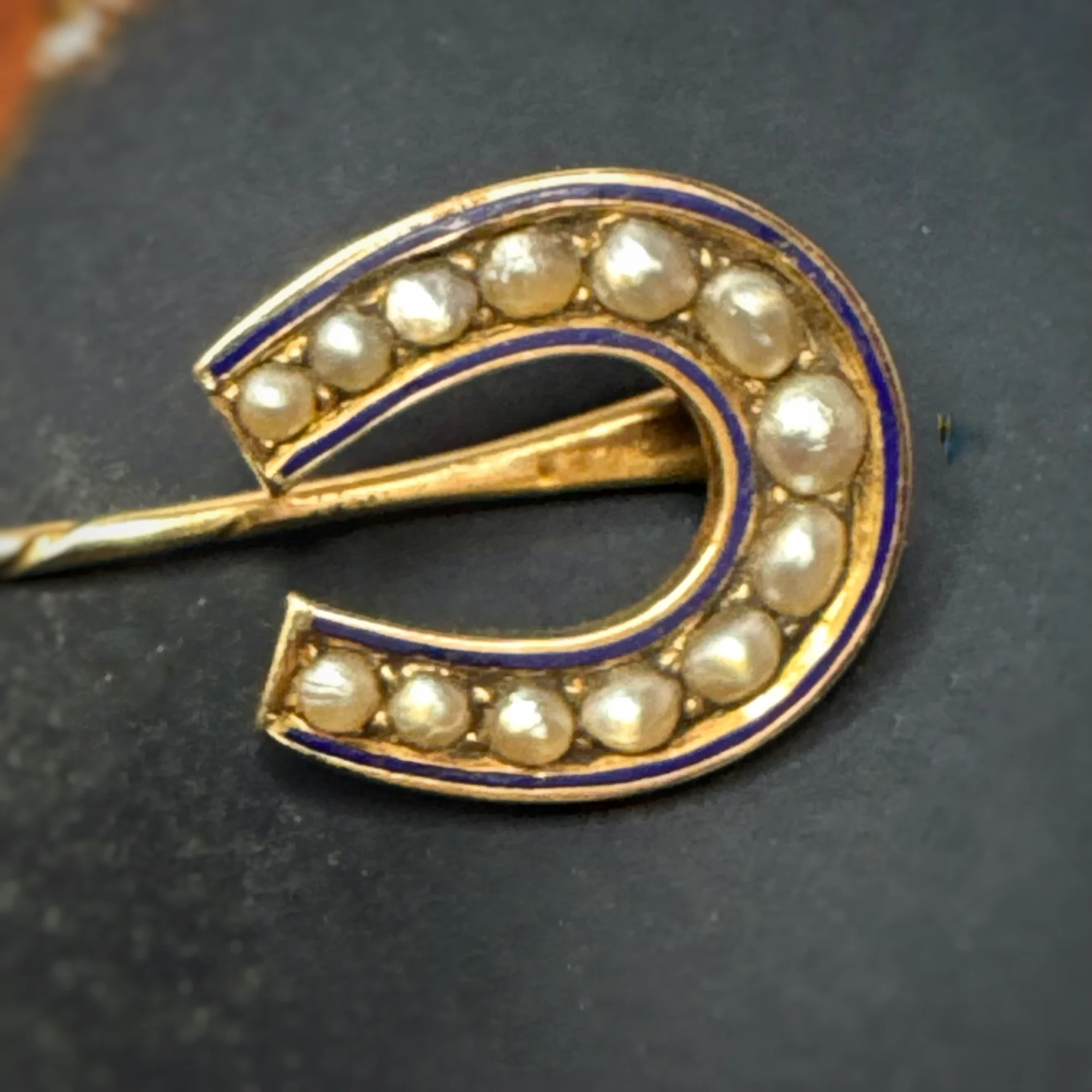 Made from unmarked 18ct yellow gold, 13 delicately set grey seed pearls and a fine royal blue enamel border. This pin is in pristine condition considering its age. Its total length is 8cm, the horseshoe measures 17mmx19mm.