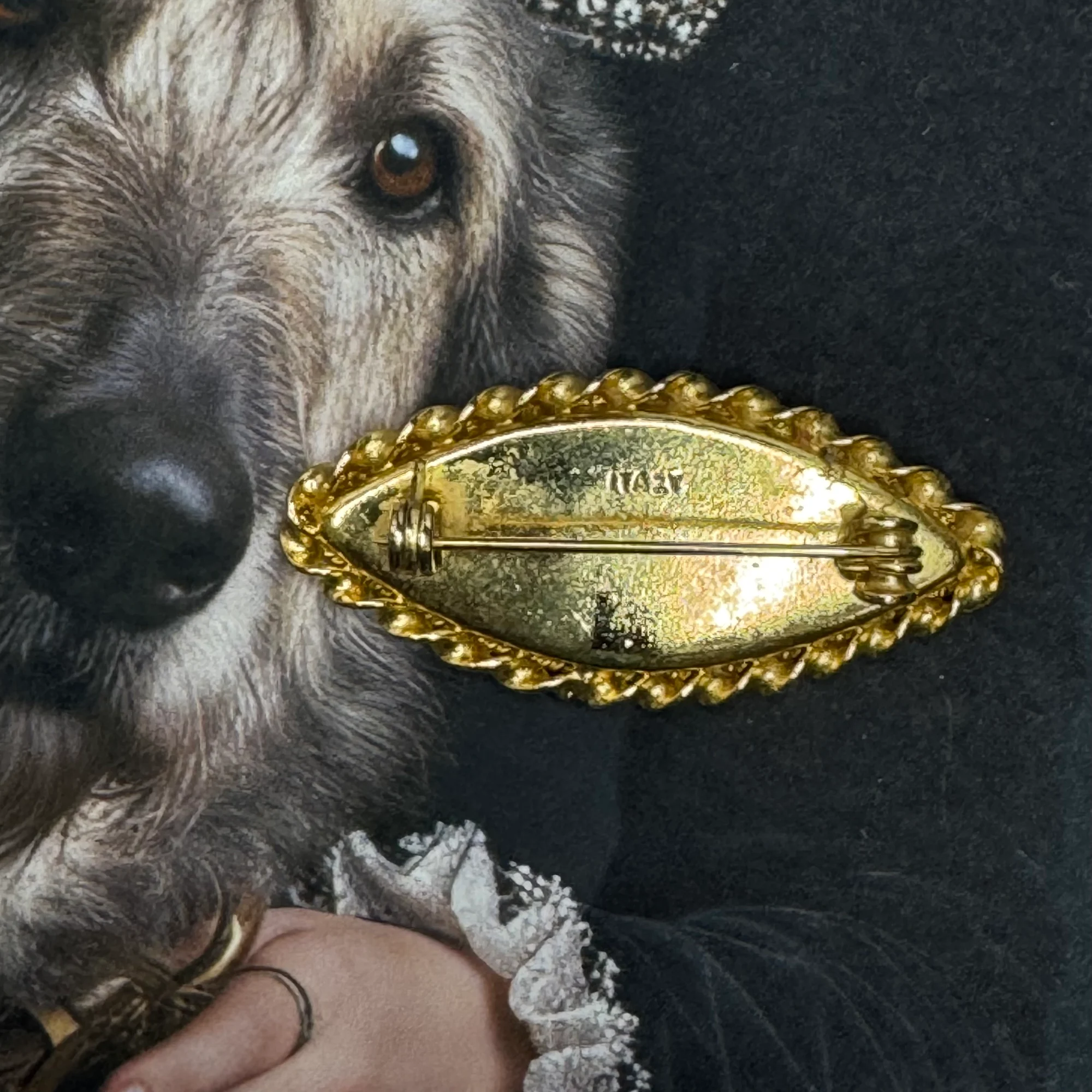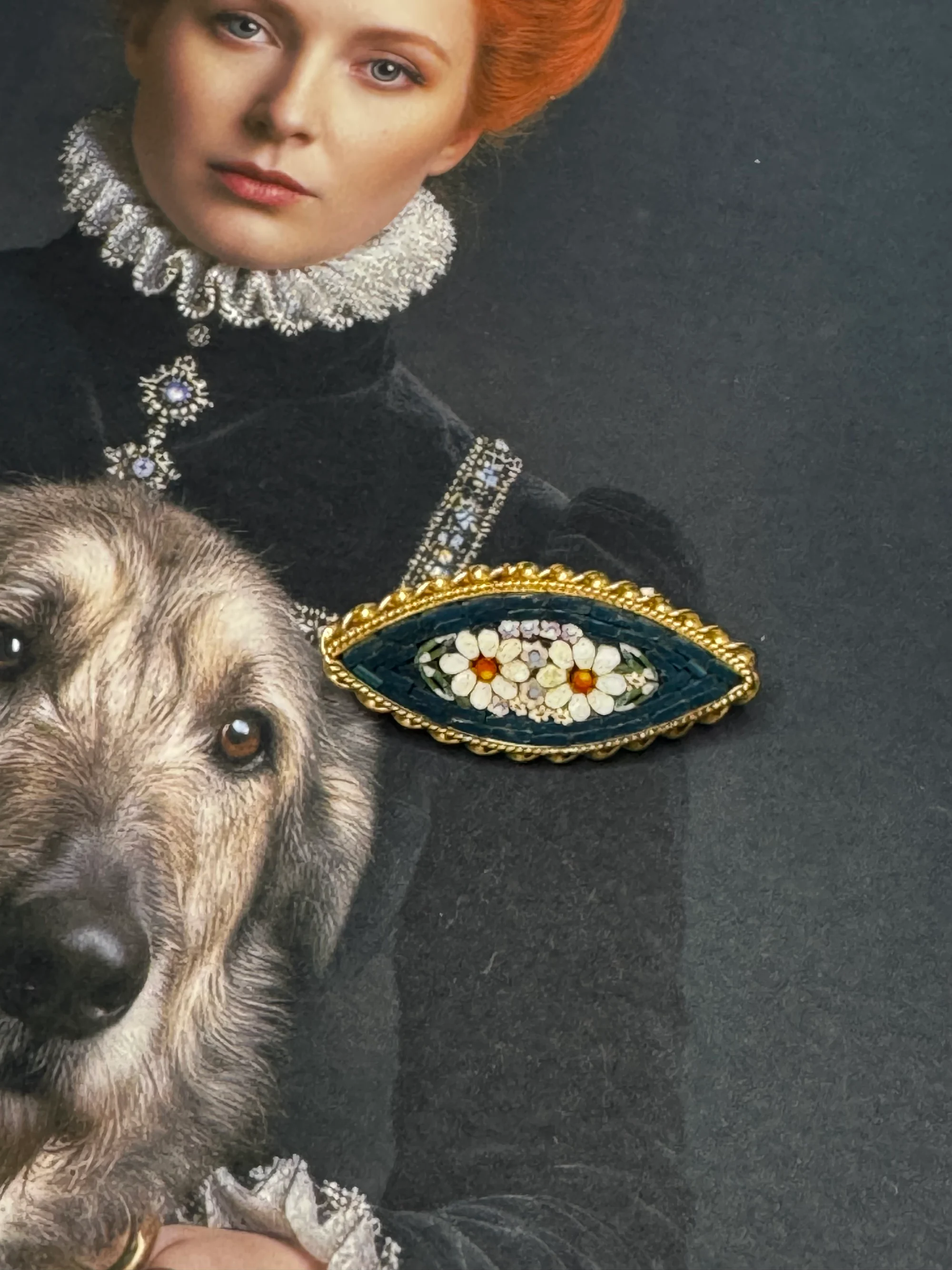This gorgeous vintage brooch will be a beautiful addition to any outfit. Yellow gold coloured metal surrounds an intricate mosaic depicting tiny white flowers. The brooch measures 5x2cms and is in perfect condition. Marked Italy on the back.